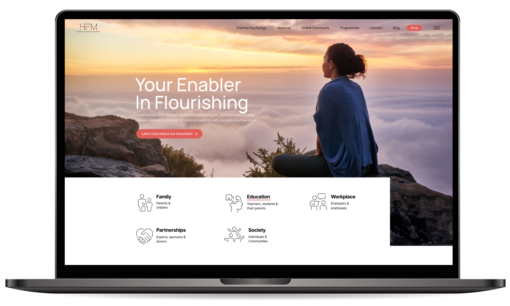 Our collaboration with the Human Flourishing Movement began with the creation of a cohesive communication strategy that showcases the power of positive psychology to enhance personal and collective wellbeing. Based on these findings, Interweave was invited to design and develop an updated website for the Movement that raises awareness of positive psychology, encouraging audiences to join, support and thrive with the HFM community.